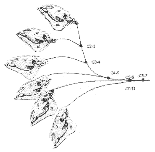 The majority of side flexion, which occurs in combination with rotation, takes place at the 3rd, 4th and 5th vertebrae. If the horse gets stiff in this area he will try to trick by tilting his head or lunging from the base of his neck, in order to reach all the way around (as in turning to touch the rider’s toe). The lower border of the neck may develop a thickened appearance, especially through the middle section as this area is not working normally