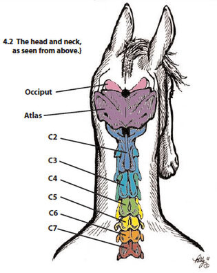 NORMAL RANGE OF MOTION: The atlas can move quite a bit in order to rotate the horse’s nose right or left. It easily moves 1 to 2 inches as it is pulled down toward the ground on each side, and also moves from front to back (toward the tail) approximately 1/4 inch.