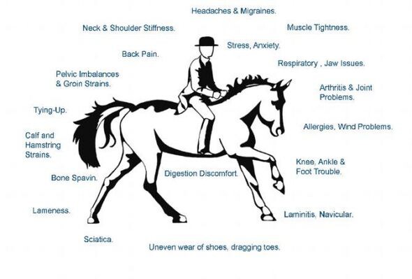 • Lesions in the skin, connective tissues (Fascia), nerves, muscles, joints and bones in the horse's back. The most common cause for these lesions is traumatic injury, but these problems can also be a result of poor tack fit or issues relating to the technique of the rider which can actually worsen these problems significantly.