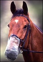A treatment for headshaking with a favorable success rate in 40% of cases is a face mask with a nose net. "The nose net provides a mechanical stimulus, like sticking a finger on your nose, which sends afferent (conducting) impulses up the nerve so it quits firing. Not all horses are improved with nose nets." It appears to give the horse dramatic relief.