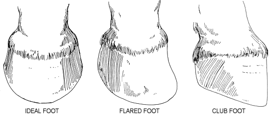 The manner in which the foot contacts the ground and loads affects the health of the foot as well as the structures above it. Severe hoof capsule shape changes are known as distortions and are the result of long term abnormal loading patterns. Examples of hoof capsule distortions are flares, displacement of coronary bands, dishing of hoof wall, cracks, sheared heels, contracted heels, under run heels and collapsed heels.