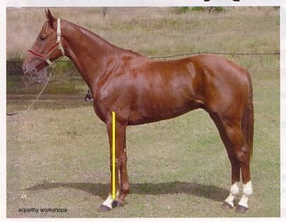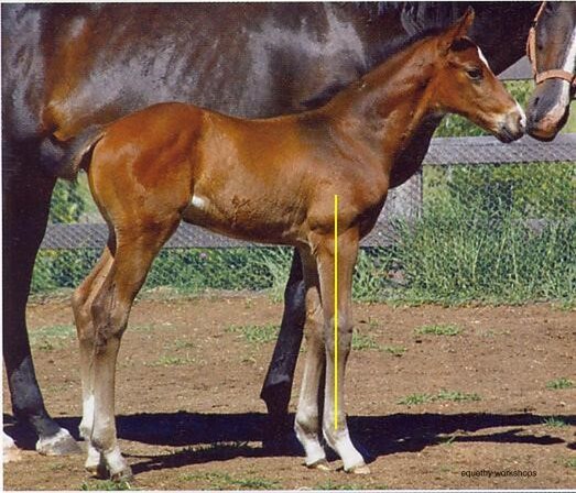 Normal Posture: Whether a young foal or an old horse they should be able to utilize fully their “stay apparatus” muscles of his forehand and partial stay apparatus of his hindquarters. To do so they must be able to keep their front legs vertical as illustrated below.